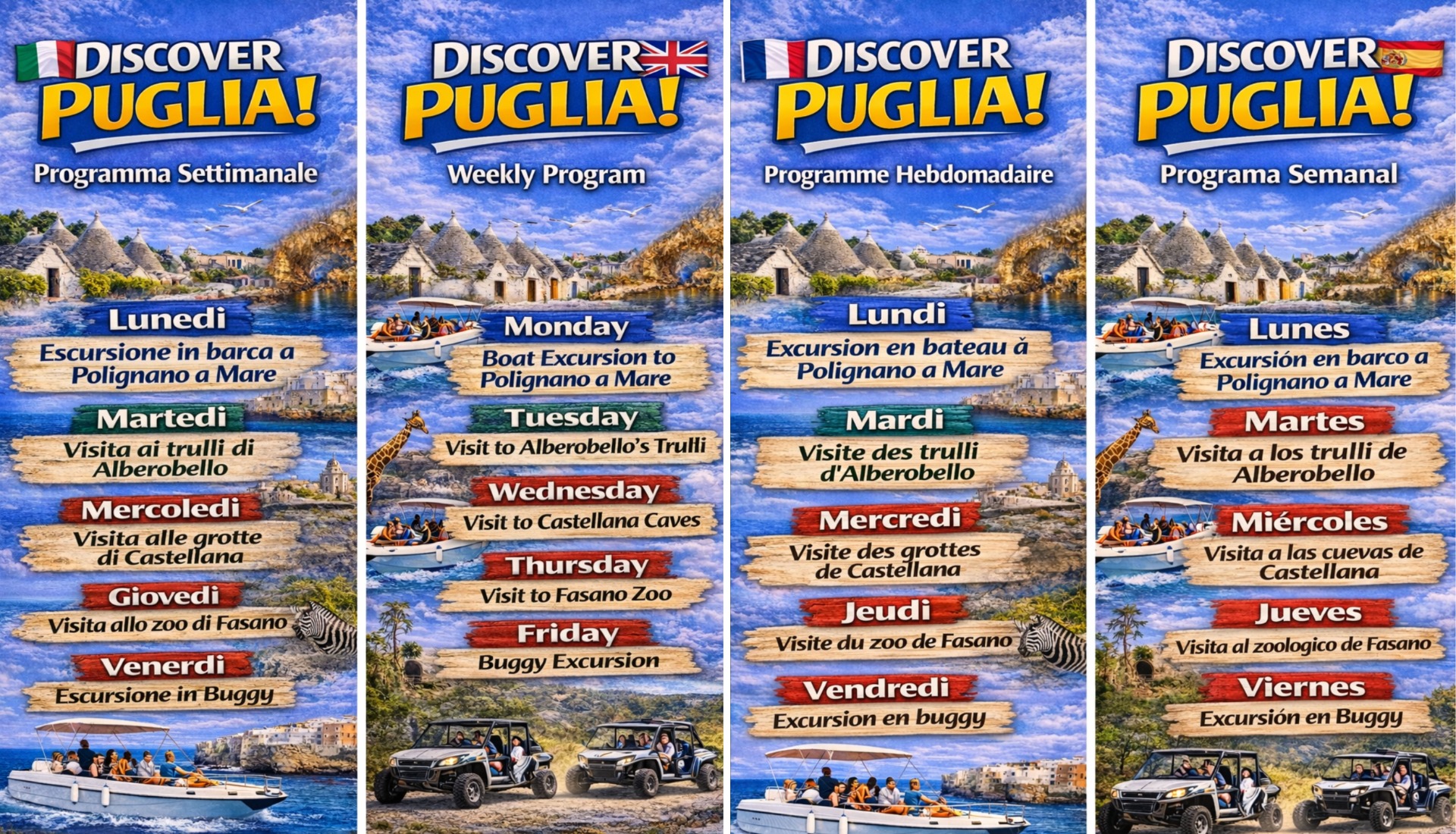 Per qualsiasi vostro desiderio "Discover Puglia" sarà a vostra completa disposizione, anche solo per una semplice informazione. Cosa aspetti Contattaci. Da oggi in Puglia hai un punto di riferimento nel rispetto del turista.